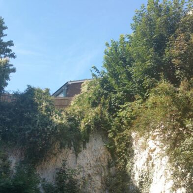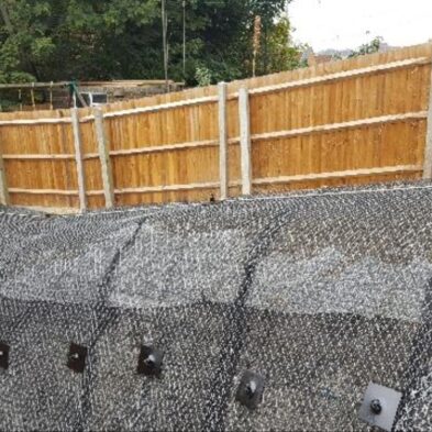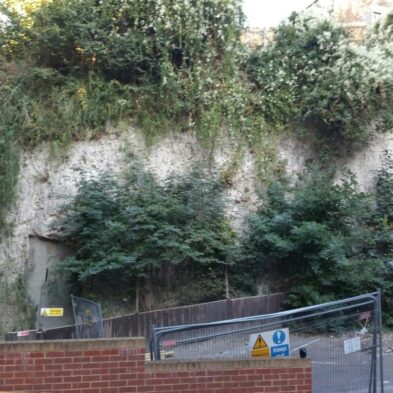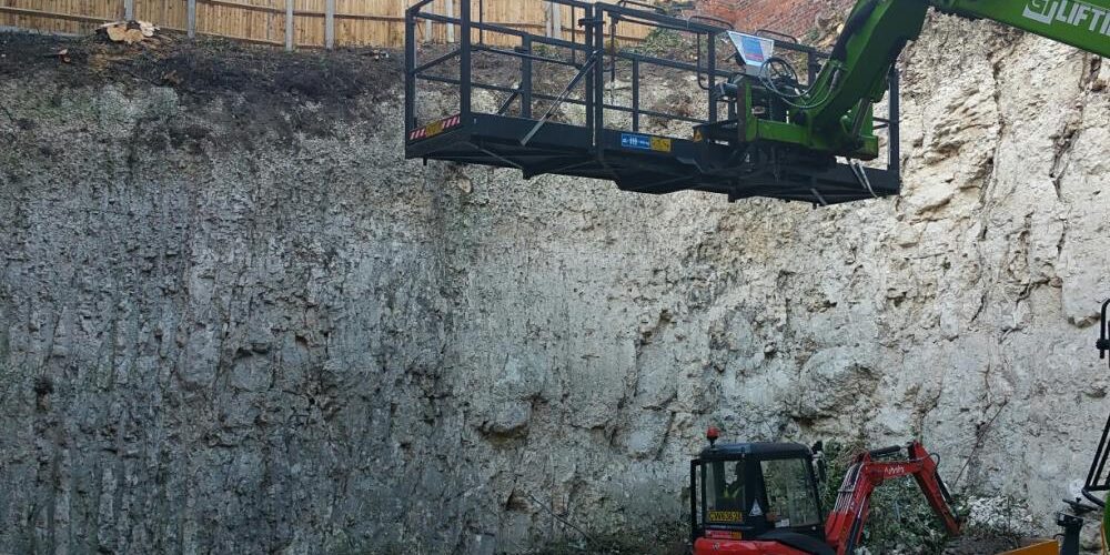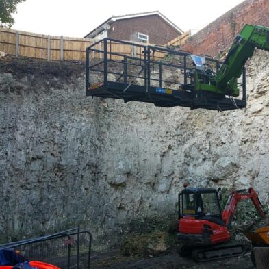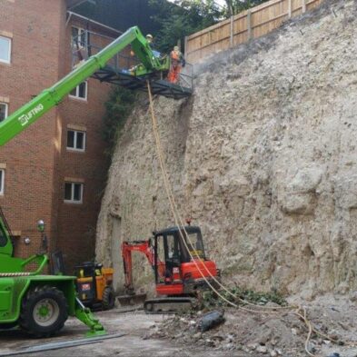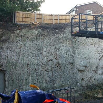 We were employed to stabilise an existing chalk bank up to 10m in height which had weathered and was spalling into the car park area below, posing a potential risk to vehicles and residents of the retirement property. Access to the working area was restricted both by the need to access the car park under existing buildings and the need to maintain safe access and egress for residents and emergency vehicles. A rotary access platform was used to provide access to the full face of the slope and the drilling works were carried out using a hand held Holman drill from within the man basket. The existing small trees and shrubs at the top and on the face of the slope had to be removed, chipped and taken off site before the stabilisation work could take place with care taken not to destabilise the bank by removing existing root systems. The bank was then stabilised with the installation of soil nails, erosion matting and rock netting to protect the existing face and retain any material which might spall in the future. The erosion matting and rock netting were secured using load nuts with a boundary cable fitted to the full perimeter of the works. The matting and netting were extended over the platform at the top of the slope up to the site boundary with pea gravel over to minimise future plant growth. Brick stitching was also carried out the boundary wall at the top of the slope to repair existing cracks.